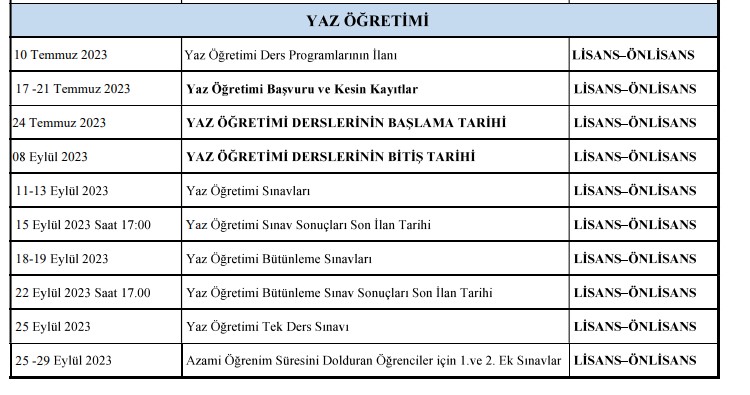 Üniversitemiz 2022-2023 Yaz Öğretiminde açılması planlanan dersler, akademik takvim, ücretler ve Yaz Öğretimi Yönergesine aşağıdaki dosyalardan ulaşabilirsiniz.