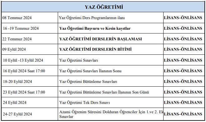 Üniversitemiz 2023-2024 Yaz Öğretiminde açılması planlanan dersler, akademik takvim, ücretler ve Yaz Öğretimi Yönergesine aşağıdaki dosyalardan ulaşabilirsiniz.